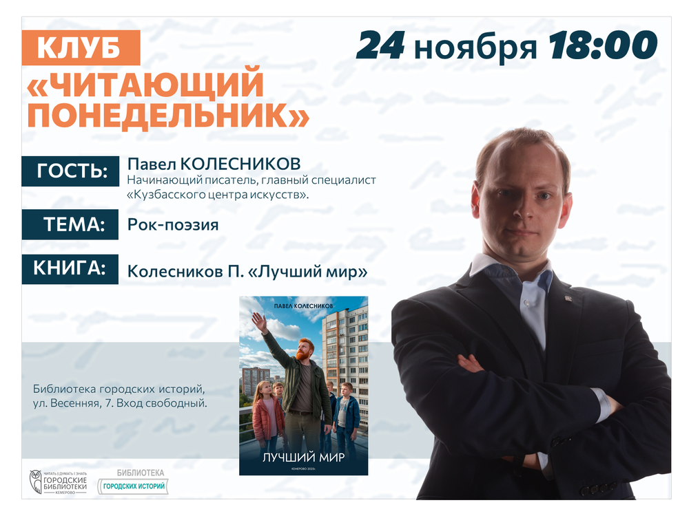 19.11Клуб «Читающий понедельник»: встреча с писателем Павлом Колесниковым в Библиотеке городских историй