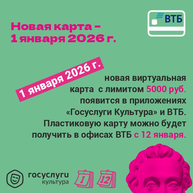 Внимание! С 1 января Банк ВТБ 2026 года станет новым оператором программы «Пушкинская карта», которая реализуется при поддержке нацпроекта «Семья».